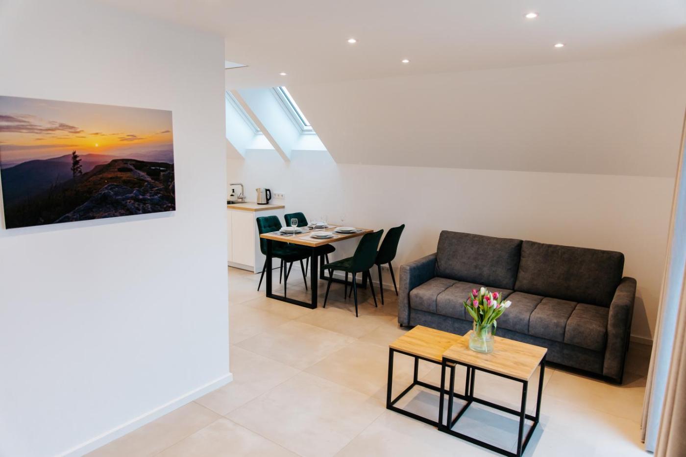 Apartament z 1 sypialnią. Boasting a private entrance, this apartment comes with 1 living room, 1 separate bedroom and 1 bathroom with a shower. Guests can make meals in the kitchenette that features a stovetop, a refrigerator, a dishwasher and kitchenware. Featuring a balcony with mountain views, this apartment also features a washing machine and a flat-screen TV with streaming services. The unit has 2 beds. Apartament - 4 osobowy. Powierzchnia pokoju ok.: 50 mkw.